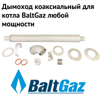 Этот коаксиальный дымоход может устанавливаться на турбированные котлы BaltGaz (с закрытой камерой сгорания) любой мощности.